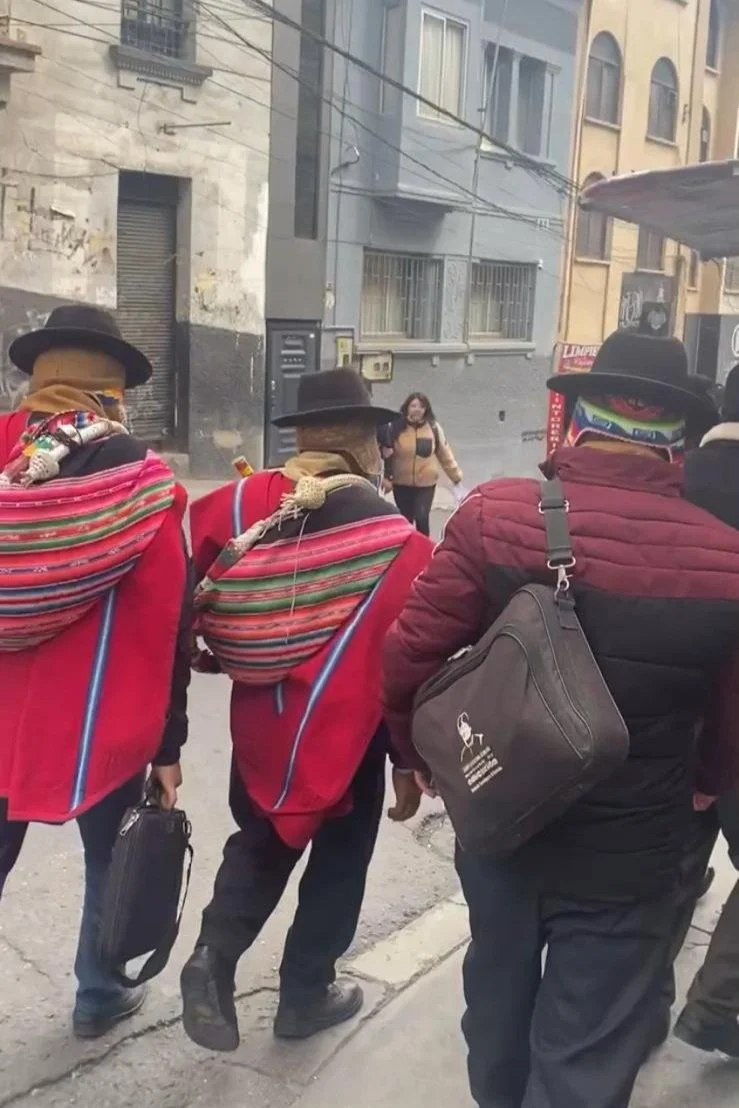 Traditional indigenous men walking the streets of La Paz, Bolivia.
