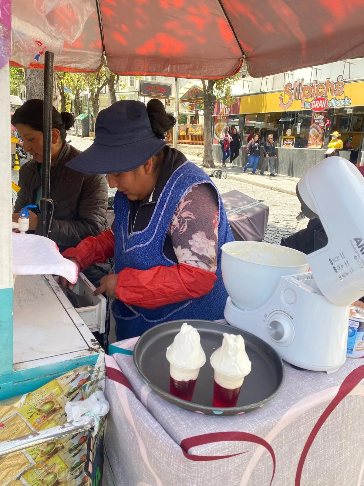 Hand-made whipped cream with jelly in the street of La Paz, Bolivia.