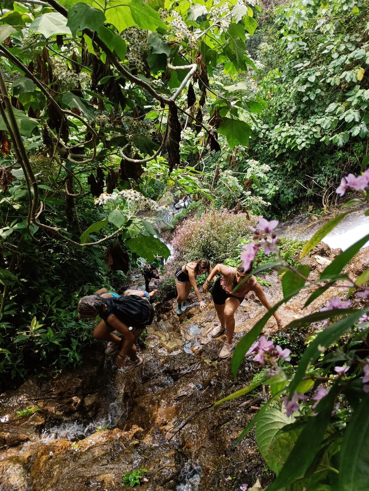 Carmit and Noy leading the group through the hike of the 7-waterfalls in Juayua, Ruta de Flores region of El Salvador.